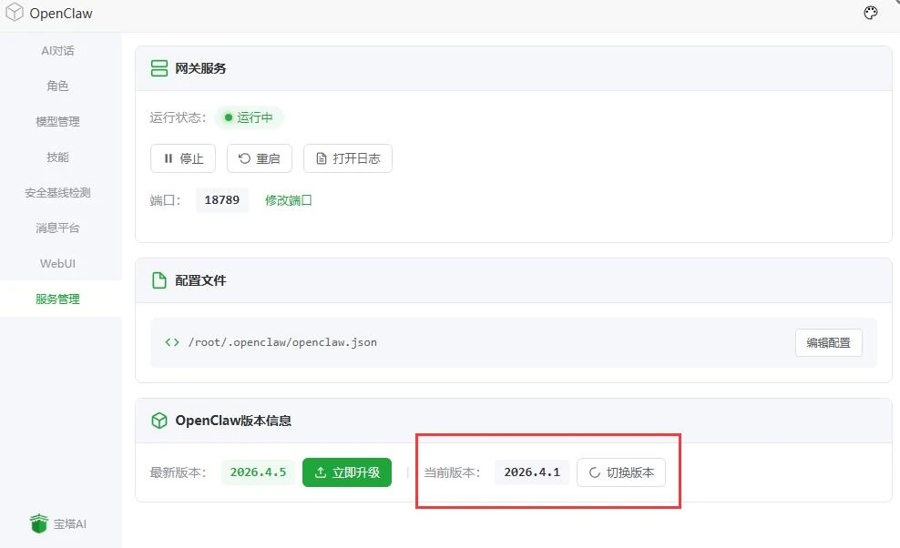 这个就会导致openclaw异常。我写文章的当下,我更新到了2026.4.1版本,而不是最新的2026.4.5.