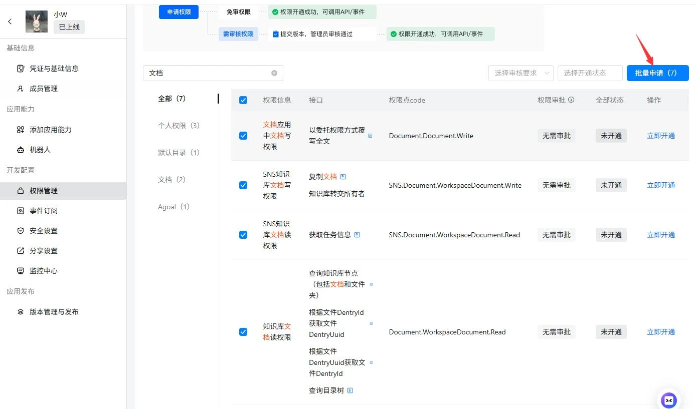 - 搜索知识库、文档和表格相关的所有权限然后批量开通。