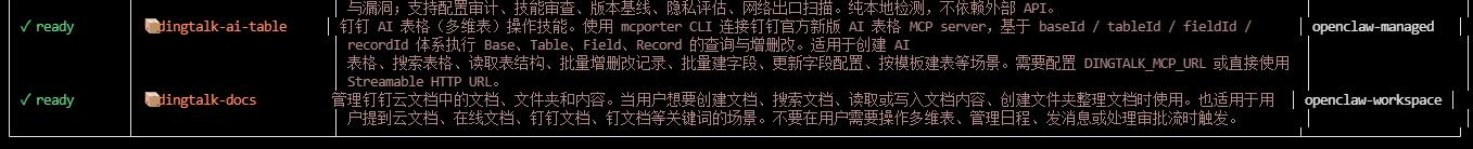 如果dingtalk-ai-table和dingtalk-docs显示 ready就表示配置好了
