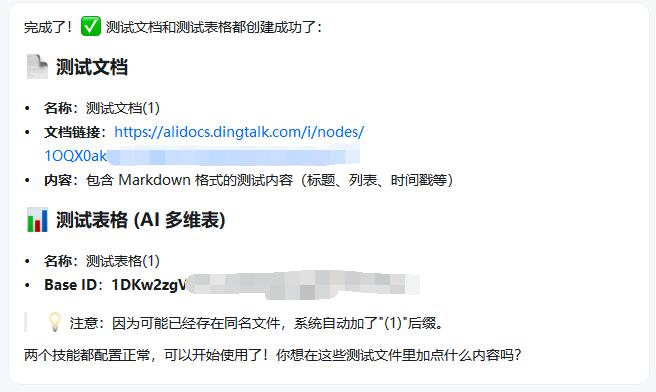 我已经配置好dingtalk-docs和dingtalk-ai-table这两个技能了,环境变量配置在 ~/.bashrc中,你帮我创建一个测试文档和一个测试表格